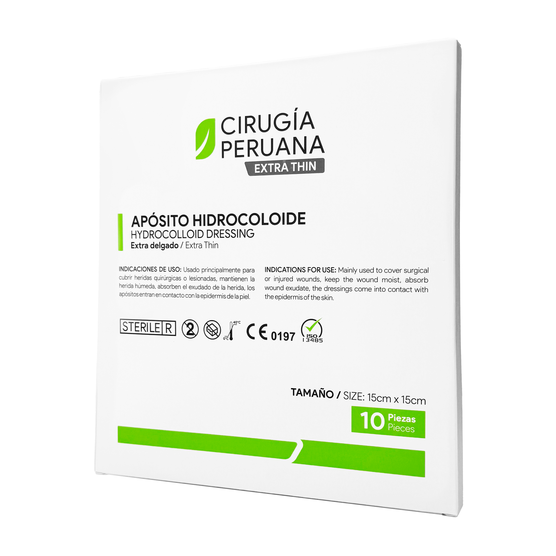 Apósito hidrocoloide, extradelgado, con esquinas redondeadas, plano absorbente y autoadhesivo, exento de partículas extrañas, constituido por una película externa de poliuretano y la capa interna de carboximetilcelulosa, gelatina (de origen porcino), pectina y adhesivo termofusible médico, que producen un ambiente húmedo ideal en el techo de la herida, controlan el exudado, favorecen su cicatrización y producen una barrera para los microorganismos externos.